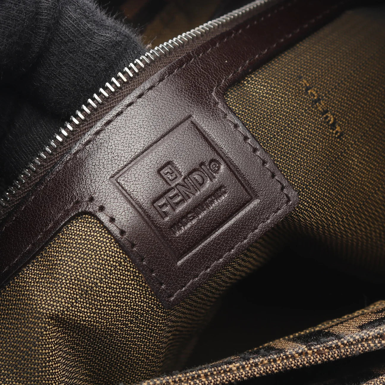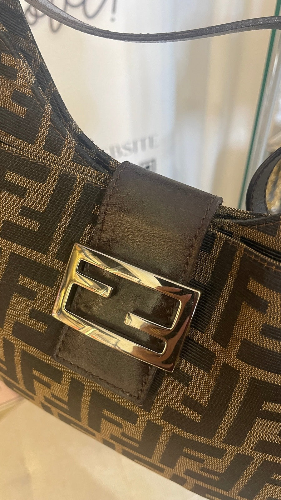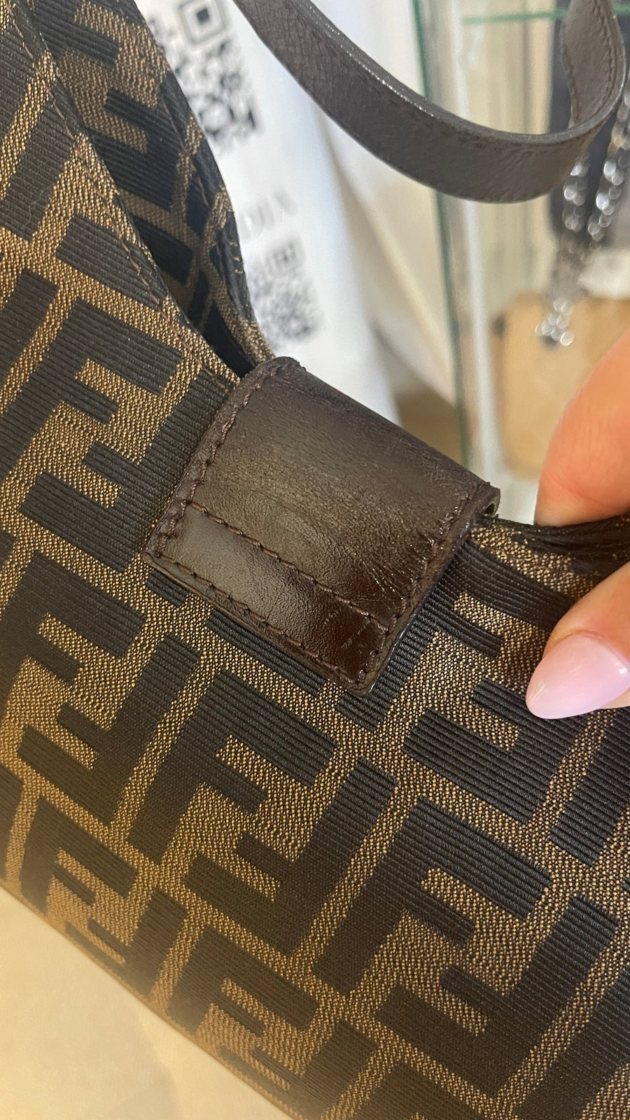 This Fendi is truly one-of-a-kind, featuring a luxurious tortoise-printed leather shoulder strap and matching front detailing that adds a bold, sophisticated touch to the classic FF canvas.