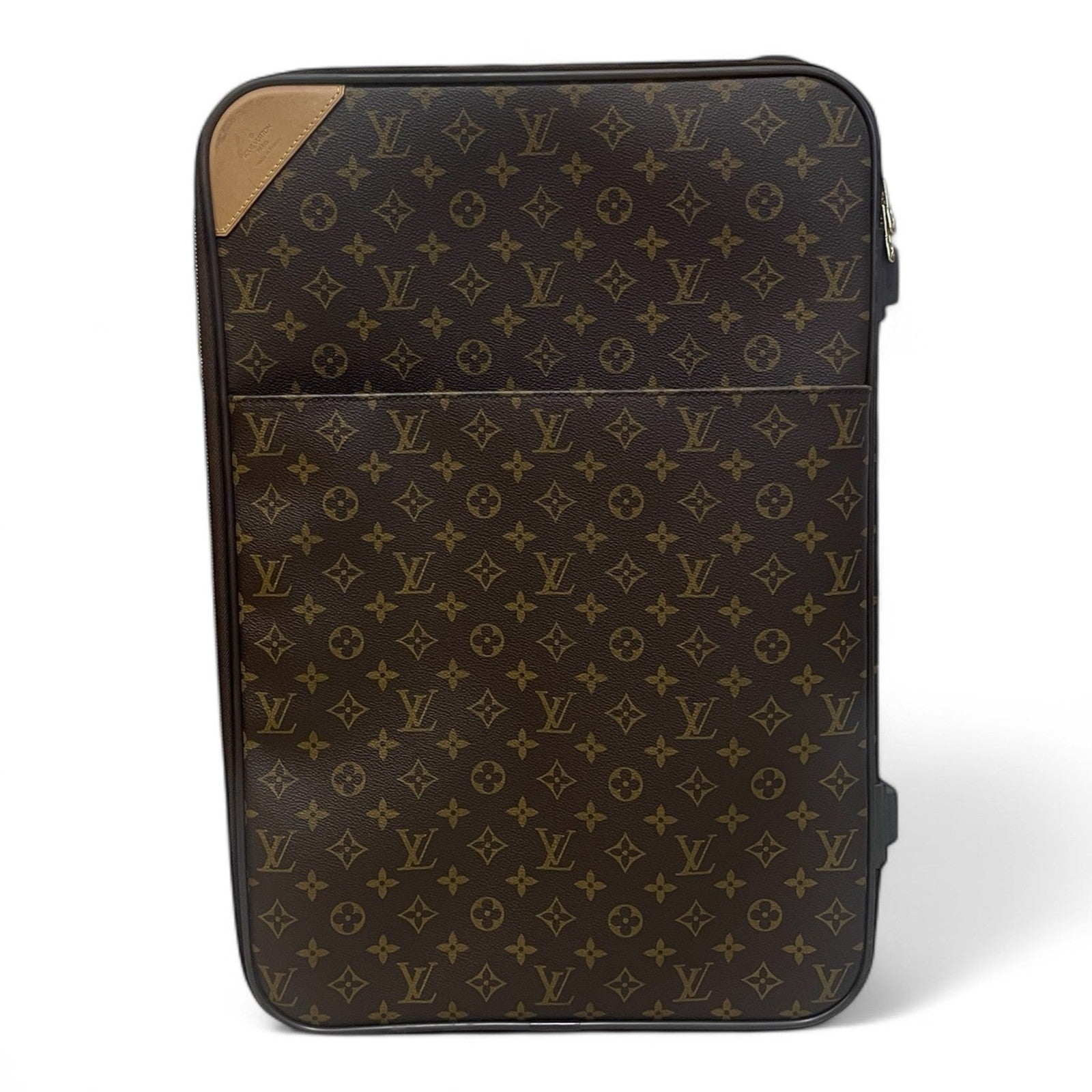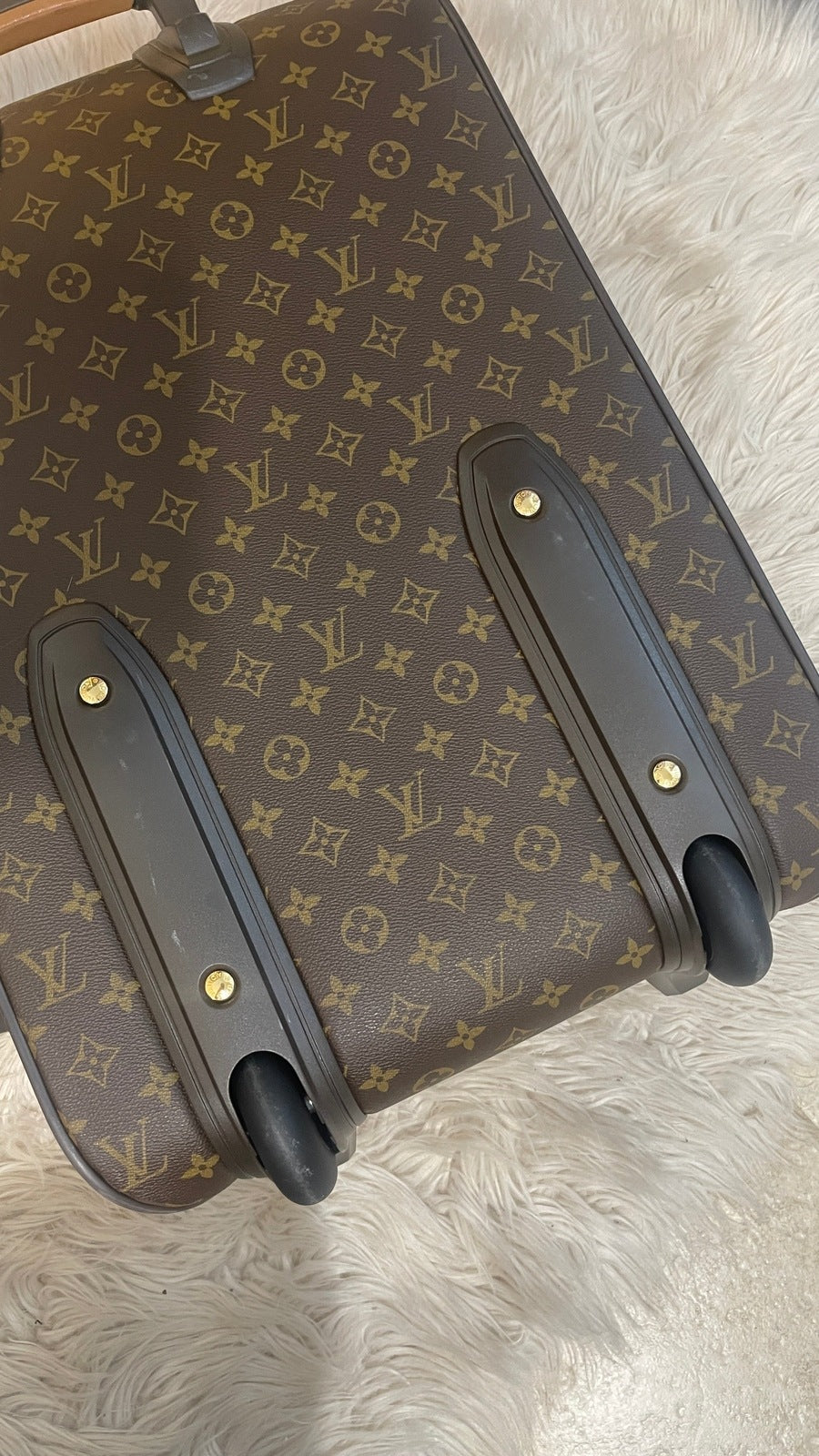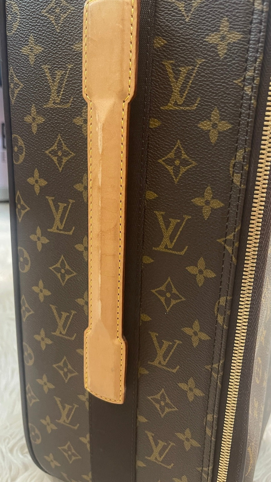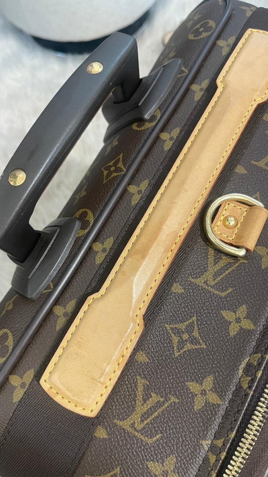 Condition: Very Good; dirt on vachetta leather, slight scratches on the back plastic bottom area, tarnish on hardware. Refer to the photos for all the details. Zippers and luggage wheels are completely functional.