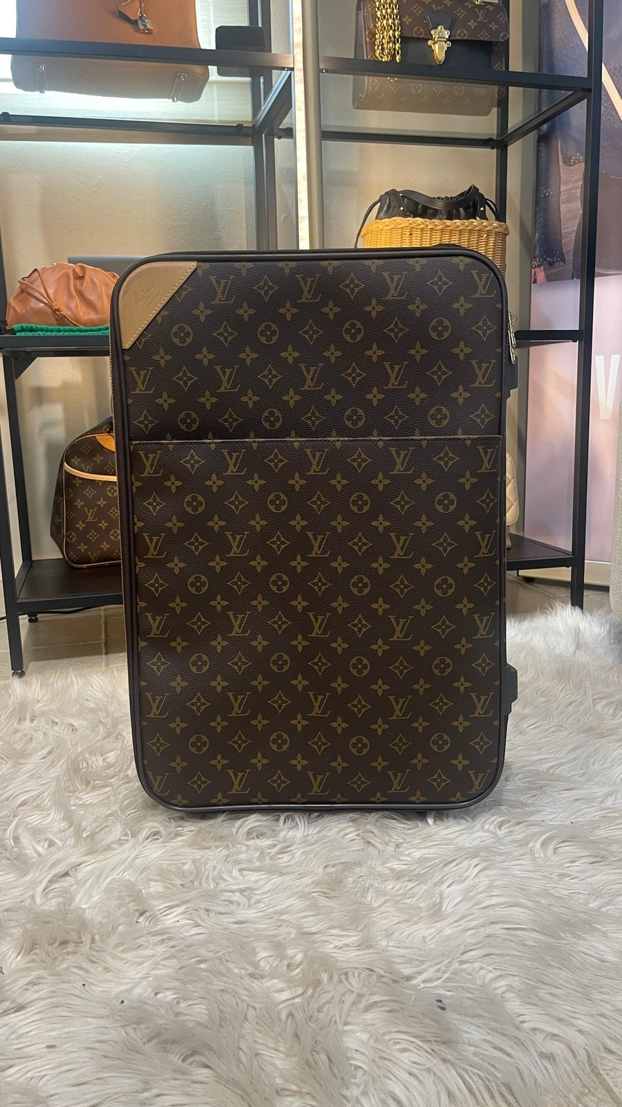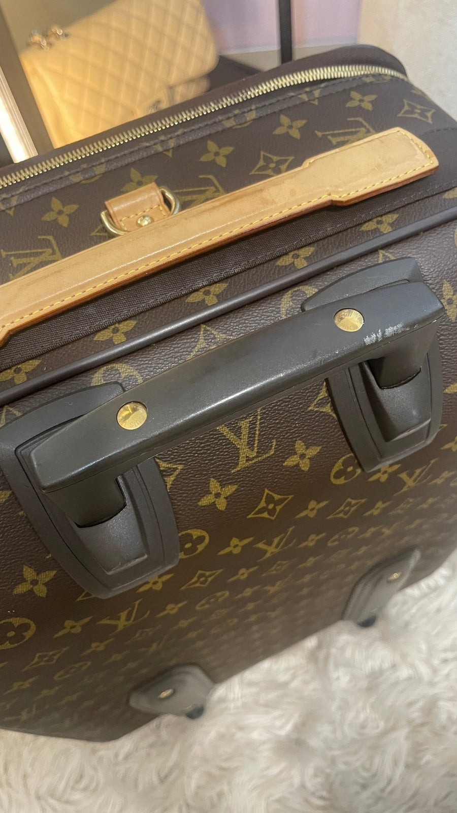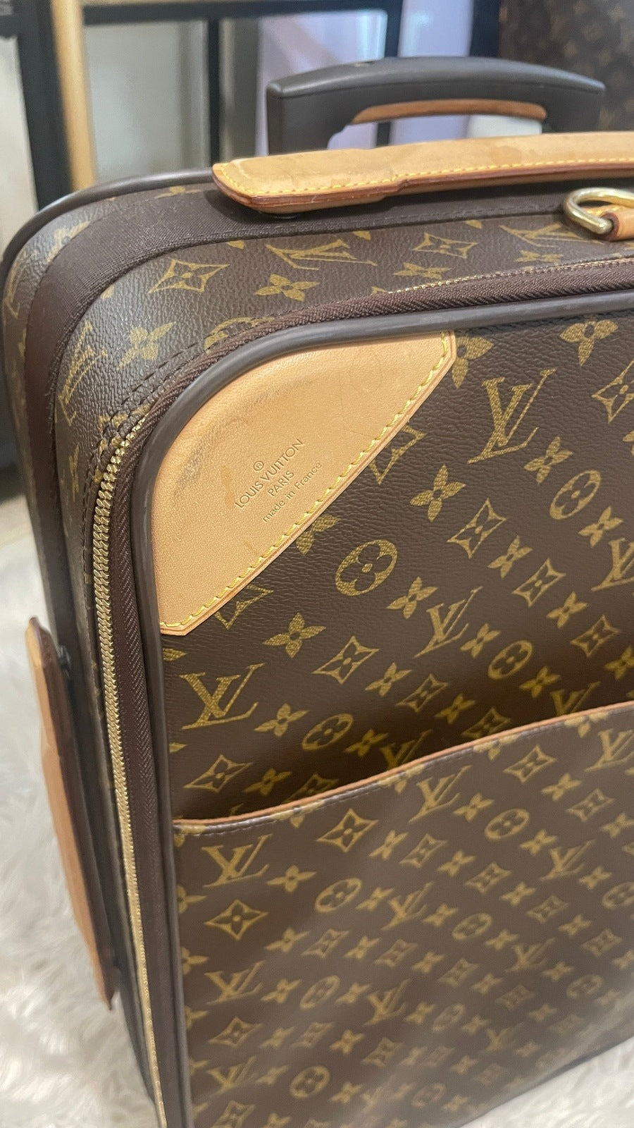 Condition: Very Good; dirt on vachetta leather, slight scratches on the back plastic bottom area, tarnish on hardware. Refer to the photos for all the details. Zippers and luggage wheels are completely functional.
