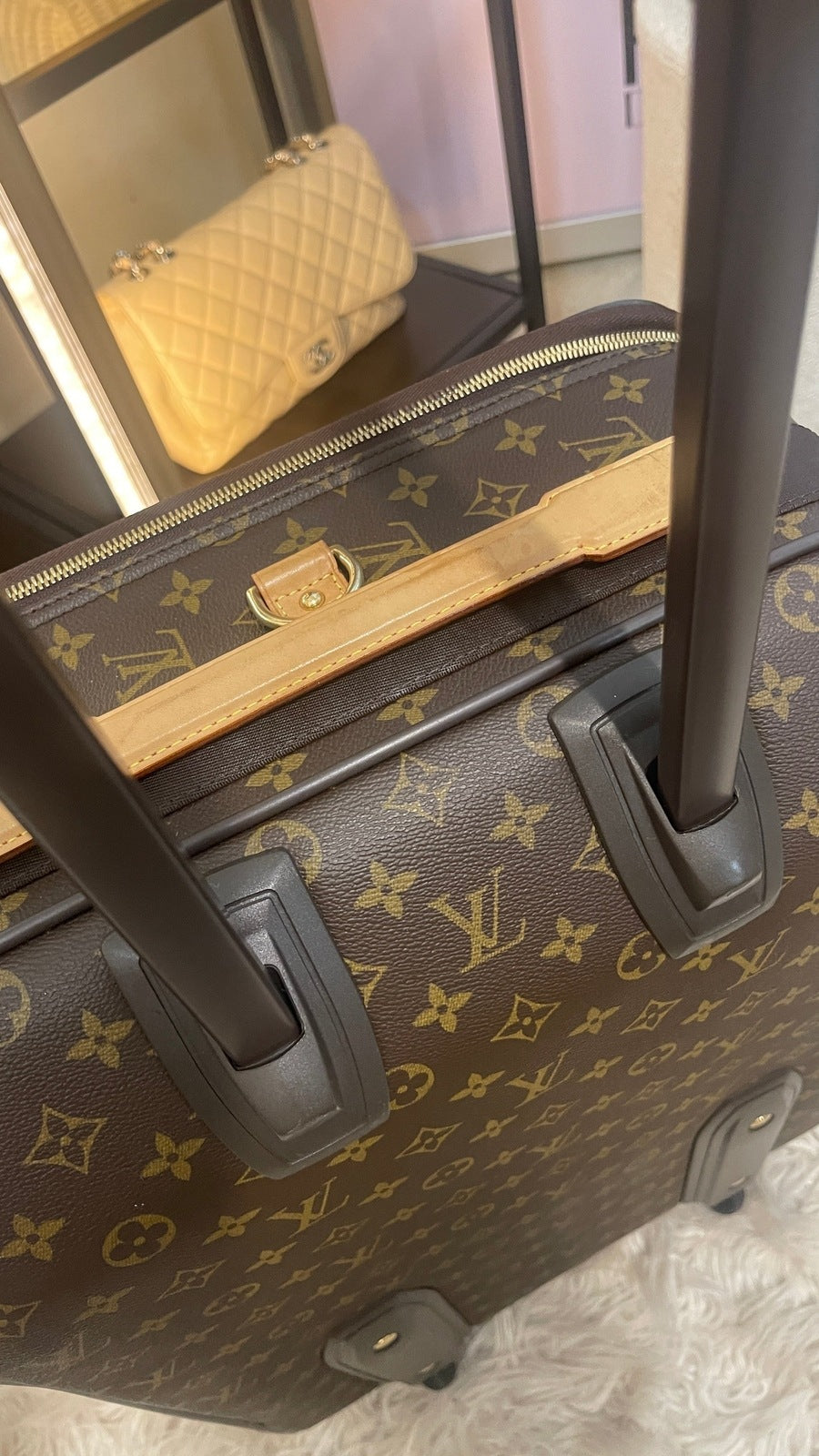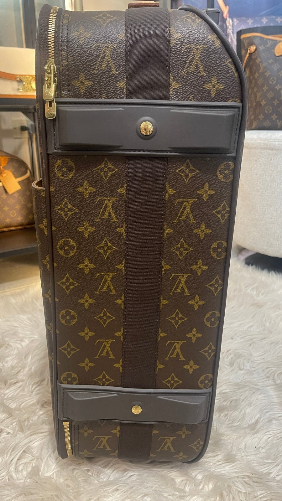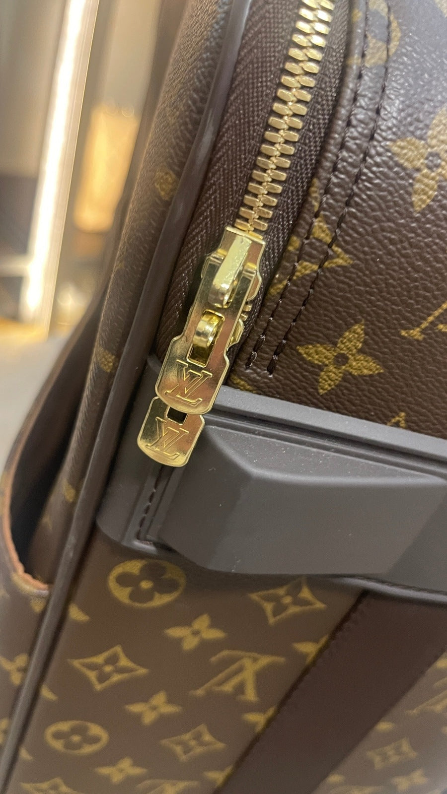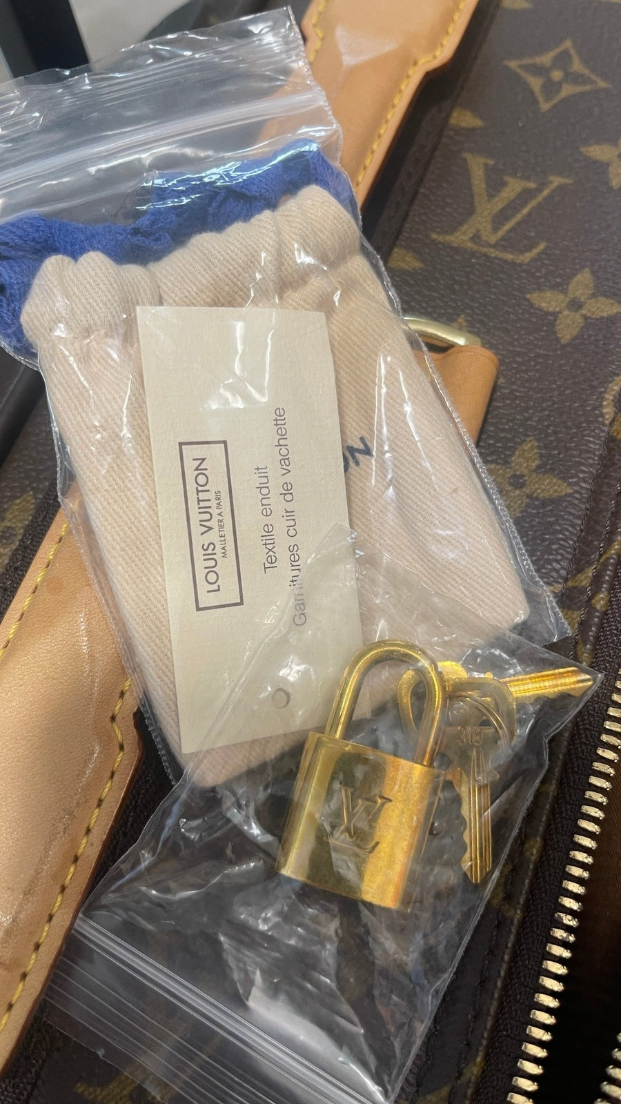 Condition: Very Good; dirt on vachetta leather, slight scratches on the back plastic bottom area, tarnish on hardware. Refer to the photos for all the details. Zippers and luggage wheels are completely functional.